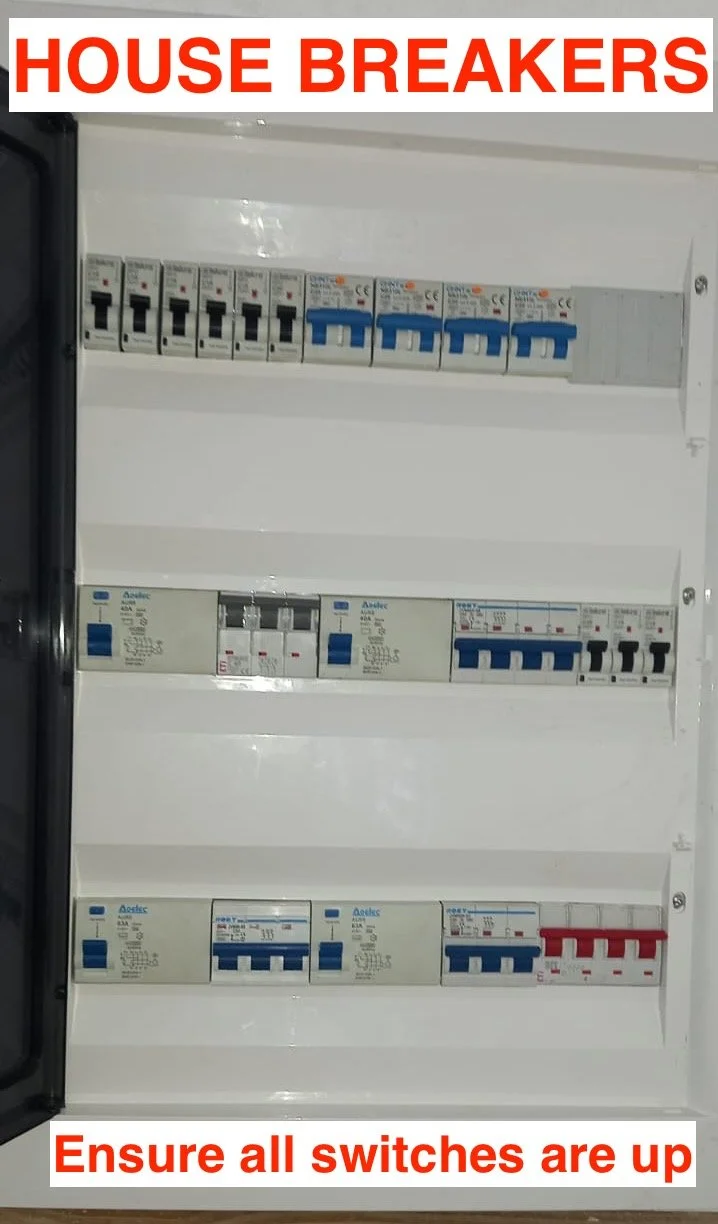 Step 1. Check to ensure all breakers inside the house (located behind the dining table) are switched on (pointing up).